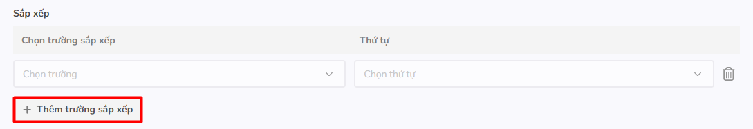 Sắp xếp: Sắp xếp danh sách hiển thị của trường tra cứu. Người dùng nhấn Thêm trường sắp xếp để thêm các điều kiện sắp xếp danh sách bản ghi của đối tượng được tra cứu. Có thể thêm được tối đa 3 trường dữ liệu.