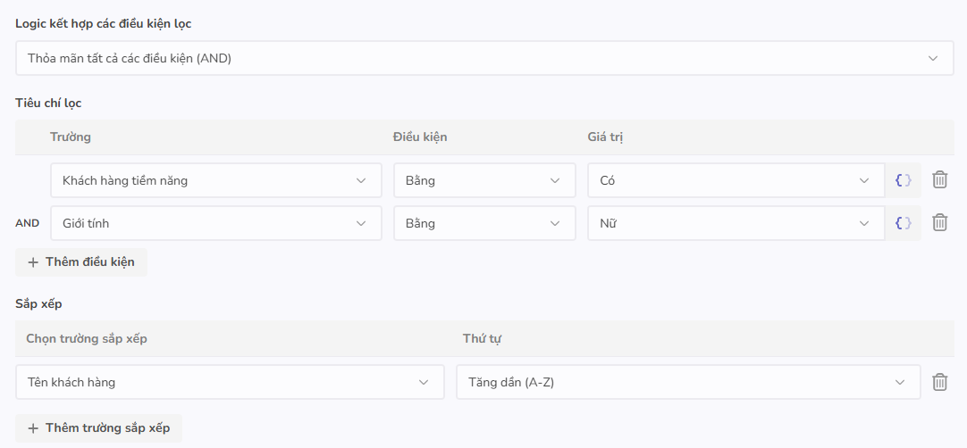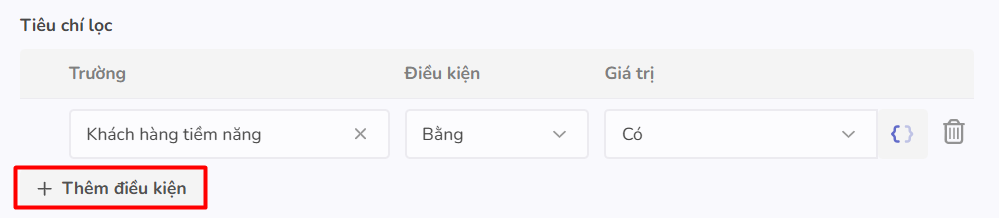 Tiêu chí lọc: Các điều kiện cụ thể được đặt ra để lọc các bản ghi trong trường tra cứu. Hệ thống cho phép lọc kết hợp điều kiện từ các trường của cả đối tượng hiện tại và đối tượng tra cứu. Người dùng nhấn Thêm điều kiện để tạo thêm các điều kiện mới, tối đa 10 điều kiện.