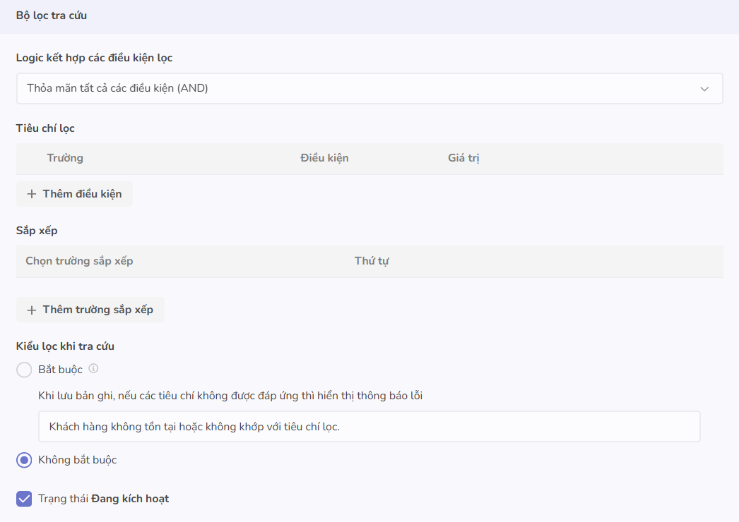 - Trạng thái Đang kích hoạt: Trạng thái của bộ lọc tra cứu. Nếu bỏ tích chọn, bộ lọc không hoạt động.